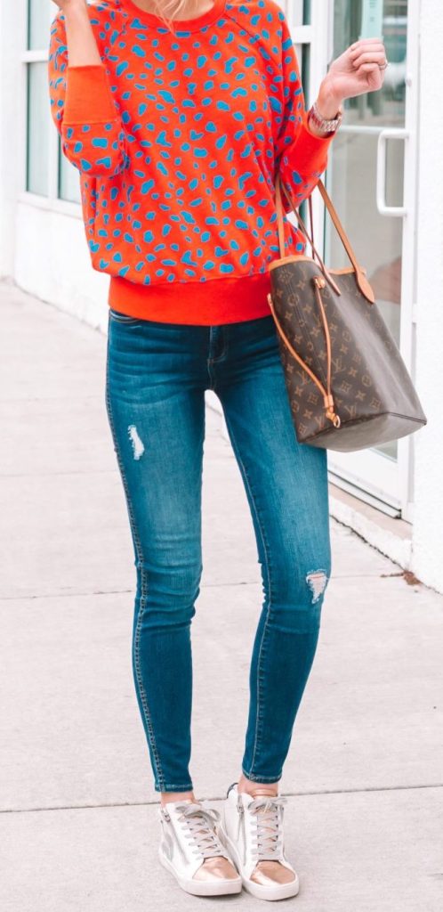 Ultimamente adoro la tendenza delle sneaker di moda, e queste sono così grandiose con l’accento metallico in oro rosa. Hanno un piccolo cuneo incorporato che le rende davvero comode! Aggiunge un cuscino. Alcune sneaker di moda non sono comode, ma queste sono fantastiche. Le ho indossate così tanto! Di solito indosso un 8,5 e a volte un 9 in sneakers. Ho preso la 8.5 e vorrei avere la 9 per un po’ più di spazio. Insieme alla mia felpa leopardata colorata, penso che questo sia il look casual perfetto e confortevole!